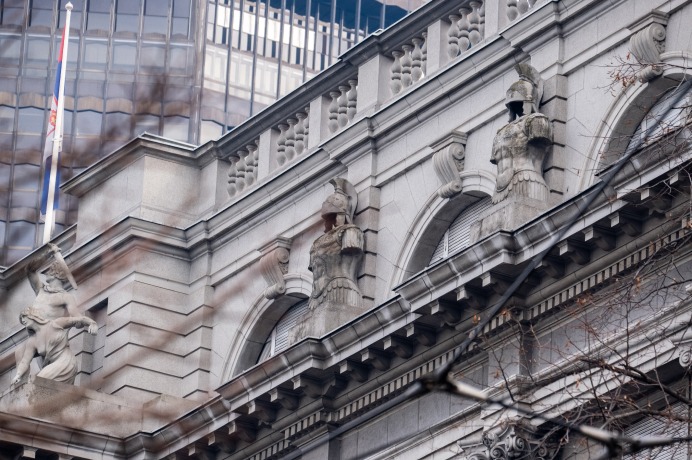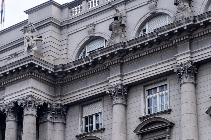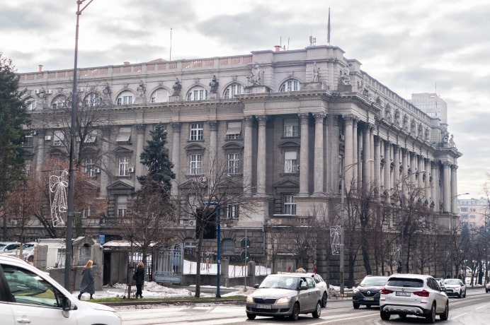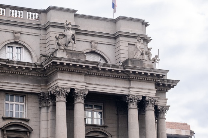 Перед вами здание старого Генштаба, также известное как «Каменная палата» или «палата Баумгартена». Построено оно в 1924–1928 годах по проекту архитектора‑эмигранта Василия Вильгельма Фёдоровича Баумгартена. Это здание нередко описывается как как «исключительно монументальный и декоративный», один из лучших примеров общественных зданий Белграда межвоенного периода в духе академизма.
